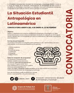A Articulación Estudiantil de Antropología y Arqueología Latinoamericana através do GT-ALA convida os estudantes de Antropologia, Arqueologia e ciências ou disciplinas afins a participar de seu projeto La Situación Estudiantil Antropológica Latinoamericana (A situação do estudante antropológico latino-americano).
