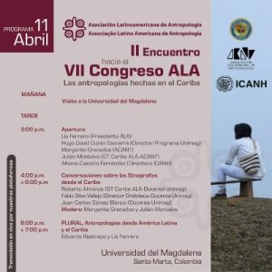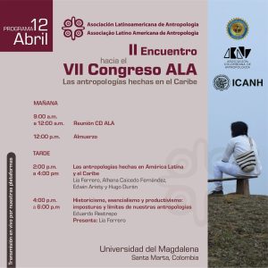 ALA, en conjunto con el GT ALA “Antropologías del Caribe”, la Asociación Colombiana de Antropología (ACANT), el Programa de Antropología de la Universidad del Magdalena y el Instituto Colombiano de Antropología e Historia (ICANH) proponen este evento con el objeto de visibilizar a las antropologías hechas en el Caribe, deuda histórica de la ALA.