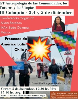 En el marco de su III Coloquio decembrino, el Grupo de Trabajo ALA «Antropología de las comunidades, los futuros y las utopías en Latinoamérica» tiene el agrado de invitarlos: Conferencia magistral “Procesos de Etnogénesis en América Latina: Brasil, Uruguay, Chile y Argentina” Presenta Dra. Alicia M. Barabas Investigadora emérita del Instituto Nacional de Antropología e …