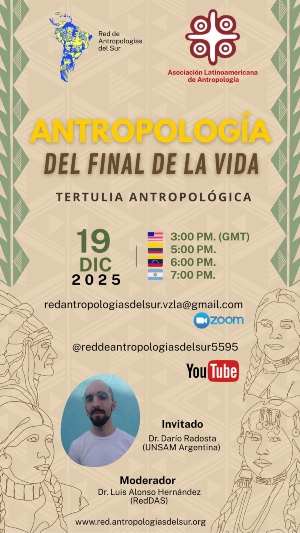 La Red de Antropologías del Sur invita a su ciclo Tertulia Antropológica, rumbo al 3er Congreso Internacional de Antropologías del Sur 2026 . Cerramos el año este viernes 19 de diciembre de 2025 con un invitado especial: el profesor Dr. Darío Radosta ( UNSAM, Argentina), quien compartirá la disertación «Antropología del final de la vida”, …