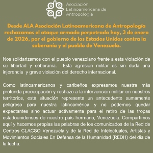 Desde ALA Asociación Latinoamericana de Antropología rechazamos el ataque armado perpetrado hoy, 3 de enero de 2026, por el gobierno de los Estados Unidos contra la soberanía y el pueblo de Venezuela. Nos solidarizamos con el pueblo venezolano frente a esta violación de su libertad y soberanía. Esta agresión militar es sin duda una injerencia …