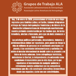 Hoy, 3 de enero de 2026, presenciamos el inicio de una etapa regresiva para América Latina y el Caribe, Quienes integramos el Grupo de Trabajo Antropologías Feministas y de Género de la Asociación Latinoamericana de Antropología manifestamos nuestra profunda consternación por los hechos que, de forma inmediata, afectan a Venezuela, pero que sin duda amenazan …